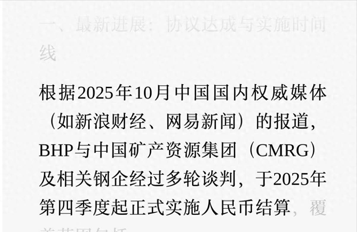 澳大利亚总理也出来表态了,虽然语气温和,但明显带有不满:“对这个变化感到失望”。然而,现实比情绪更有说服力。短短七天后,10月初,必和必拓终于改变立场,与中国达成协议,同意一部分铁矿石用人民币结算。